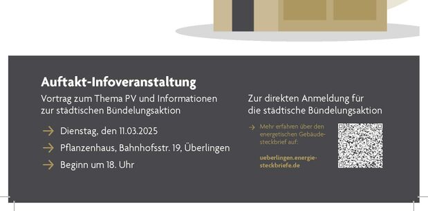 Am 11. März wird die Energieagentur Ravensburg einen Vortrag zum Thema Photovoltaik halten. Im Anschluss wird die städtische PV-Bündelungsaktion vorgestellt, welche von Fünf Prozent und der Stadt Überlingen näher erläutert wird.