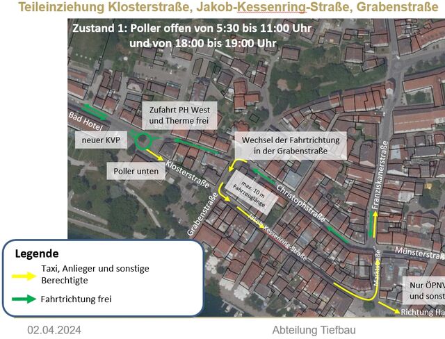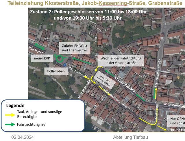 Ab dem 25. Juli 2023 werden die Baumaßnahmen mit dem 2. Bauabschnitt (Umgestaltung der Klosterstraße sowie der Grabenstraße) fortgesetzt. Die Durchfahrt von der Christophstraße in die Jakob-Kessenring-Straße ist ab diesem Zeitpunkt nicht mehr möglich. Für Anwohner und Anlieger der Jakob-Kessenring-Straße und der Hafenstraße besteht die Möglichkeit der Zufahrt über eine Umleitung von der Franziskaner Straße kommend über die Marktstraße (entgegen der bisherigen Fahrtrichtung).