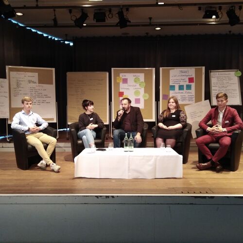 Bei der anschließenden Podiumsdiskussion konnten die anwesenden Schülerinnen und Schüler den Jugendgemeinderäten Fragen zur Arbeit des Gremiums stellen. Abgerundet wurde das Programm durch eine musikalische Einlage von Ina Holzer.
