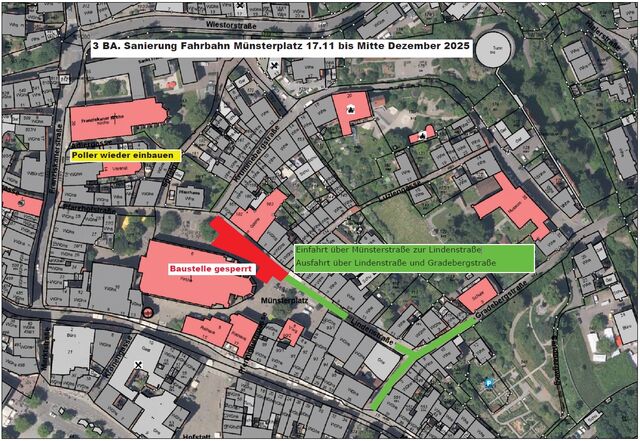 Die Bauarbeiten des 1. und 2. Bauabschnitts in der Lindenstraße und Pfarrhofstraße konnten Anfang November 2025 abgeschlossen werden. Ab dem 17. November 2025 soll der dritte und letzte Bauabschnitt am Münsterplatz von der Krummebergstraße bis zur Luziengasse instandgesetzt werden.