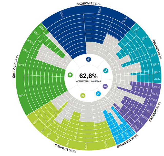 Das DGNB-System umfasst 37 Kriterien, die in einem Punktesystem nachgewiesen werden müssen. Der Fokus liegt dabei gleichberechtigt auf den Themengruppen Ökologie, Ökonomie und Soziales.