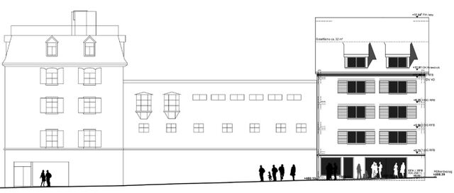 Der neue Wohnraum, verteilt auf vier Vollgeschossen und einem Dachgeschoss mit Schleppgaupen, wird in Holzrahmenbauweise mit Massivholzdecken errichtet. Als aussteifendes Element dient der Erschließungstrakt in Recycling – Beton, der auch für die Gründung und Bodenplatte verwendet wird. Holzfenster mit Schiebeläden und einer Putzfassade geben dem Gebäude den altstadtgerechten Charakter.