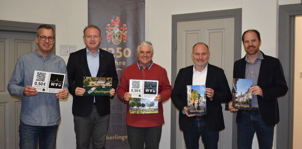 V.l. Uwe Zscherp (2. Vorsitzender WVÜ), OB Jan Zeitler, Reinhard Haas (1. Vorsitzender WVÜ), Stefan Schneider (Wirtschaftsförderer Stadt Überlingen), Jürgen Jankowiak (Geschäftsführer ÜMT). Foto: Stadt Überlingen.